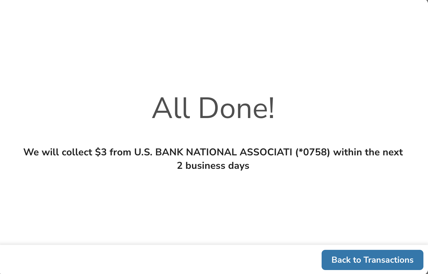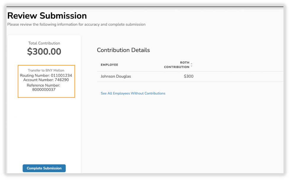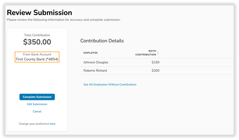 As you go through the payroll submission process, you will arrive at the “Review Submission” page. This is the final step in completing your contribution processing. Depending on how you set up your bank account information, your page will be set up accordingly.