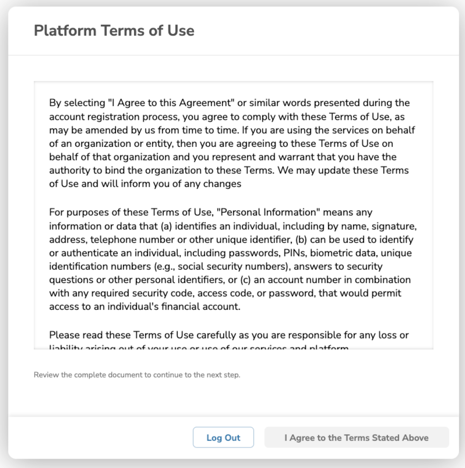 Once registration is complete, you can log in to the portal. Upon login, you will be required to read and agree to the platform's terms of use.