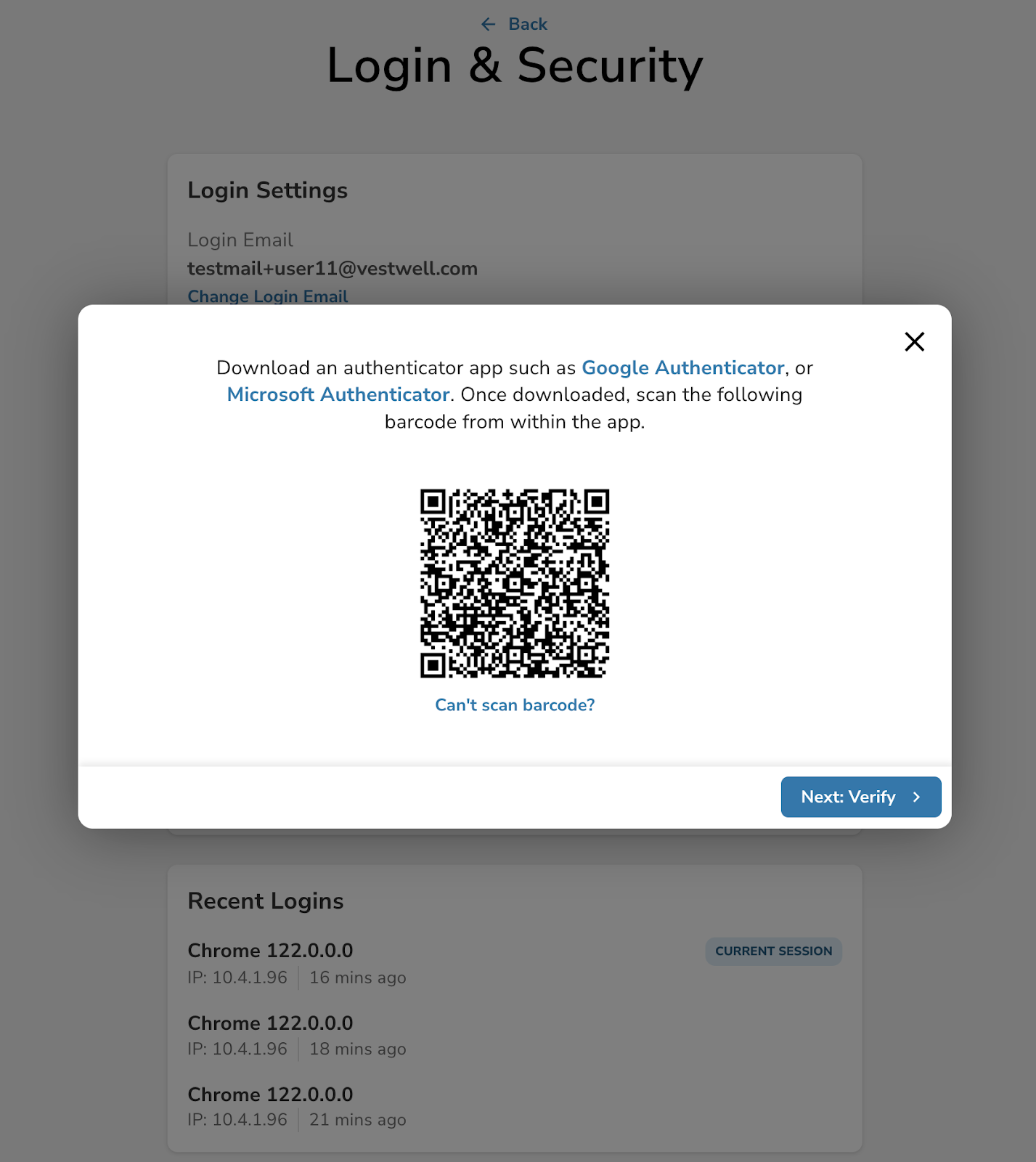 - Then, scan the QR code on your screen and hit Next: Verify.